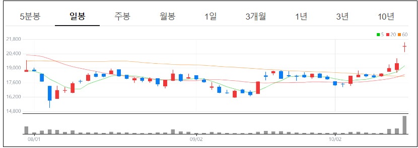 장중 거래대금은 전일보다 약 3배 이상 늘어난 7245억원에 이른다. 삼성전자, SK하이닉스에 이어 이날 코스피 거래대금 3위에 해당하는 기록이다.
