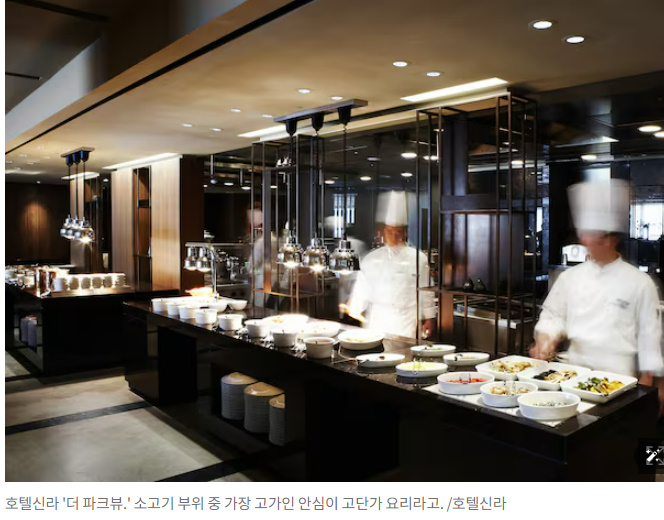 양갈비나 소갈비 같은 바비큐 메뉴는 호텔에서 손해를 감수하는 요리로 꼽힌다. 질 좋은 고기 싫어하는 사람이 드문 만큼 “종류는 많은데 먹을 게 없다”는 느낌을 주면 안 되기에 공을 들인다. 롯데호텔 관계자는 “시즌별 차이는 있지만 ‘프렌치 랙’(어린 양의 갈빗살)과 함께 소공점 기준 랍스터와 우대갈비, 잠실점 기준 베이징 덕과 비프 웰링턴이 고단가”라고 귀띔했다. 신라호텔 관계자는 “보통 호텔 뷔페에서는 소고기 등심이나 채끝, 살치살 등을 사용하는데 ‘더 파크뷰’에서는 안심을 쓴다”며 “소고기 부위 중 가장 고가인 요리”라고 했다.