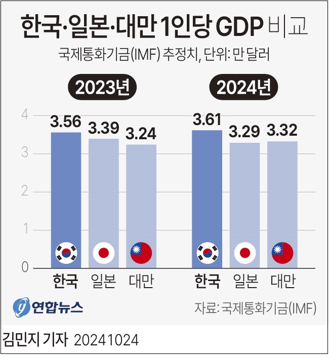 24일 한국은행 등에 따르면 국제통화기금(IMF)은 지난 22일 발표한 '세계경제전망'(World Economic Outlook) 보고서에서 올해 한국의 1인당 국내총생산(GDP)이 지난해에 이어 올해도 일본과 대만에 여유 있게 앞설 것이라고 전망했다.
