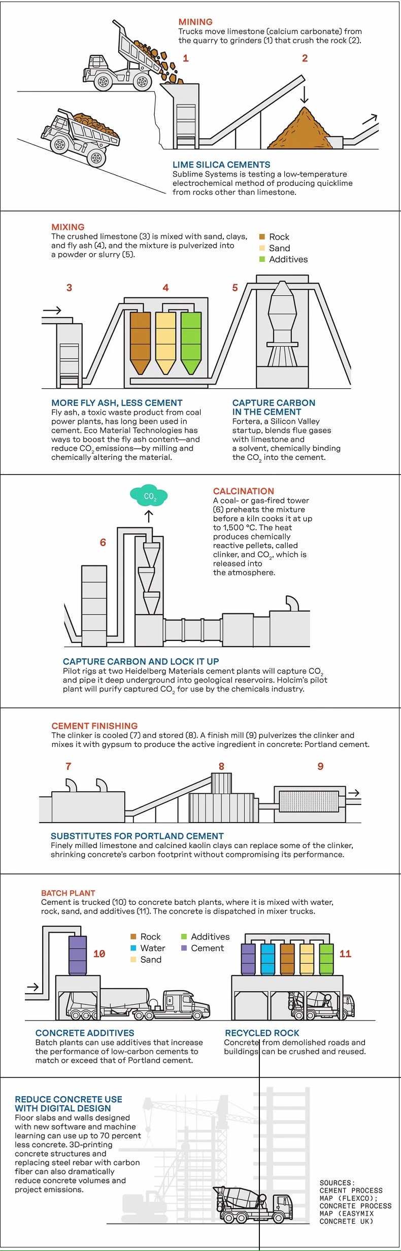 시멘트 생산업체는 종종 수십 년 분의 돌을 공급할 수 있는 석회암 채석장 옆에 대규모 공장을 짓습니다. 돌은 분쇄된 다음 일반적으로 칼슘, 실리콘, 알루미늄, 철을 포함하는 적은 양의 다른 미네랄과 결합하면서 단계적으로 가열됩니다. 혼합 및 조리에서 나오는 것은 클링커라고 하는 작고 단단한 덩어리입니다. 조금 더 가공, 분쇄 및 혼합하면 이러한 펠릿이 분말 포틀랜드 시멘트로 바뀌는데, 이는 기존 콘크리트 생산에서 배출되는 CO 2 의 약 90%를 차지합니다 [인포그래픽, "더 깨끗한 콘크리트로 가는 길" 참조].