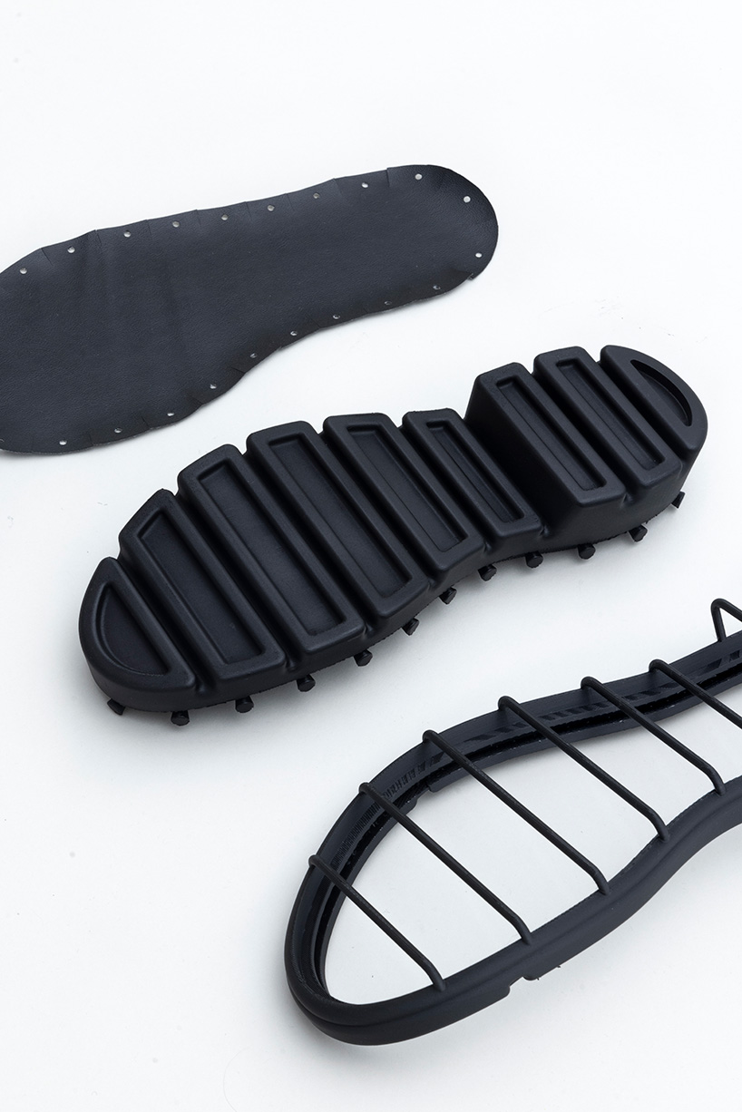 디자이너 클레멘트 드 쿠만의 Joon 슈즈 컨셉은 혁신적인 탄성 기반 조립을 통해 이를 해결합니다. 신발 밑창은 가장자리를 따라 홈이 나 있으며, 신발 윗부분의 해당 천공과 연결됩니다. 조립은 이러한 곡선을 따라 탄성을 꿰매어 윗부분을 밑창에 고정함으로써 완료됩니다. 속이 비어 있는 탄성은 밑창 홈을 잡아 부품을 함께 유지합니다. 밑창과 탄성은 모두 쉽게 재용해 및 재활용할 수 있는 열가소성 수지인 TPU 95A로 만들어졌습니다. 주로 가죽으로 제작된 윗부분은 소량의 스트레치 원단과 같이 최소한의 추가 소재를 포함하며, 가볍게 꿰매어 제자리에 고정되므로 제거할 수 있습니다. 이 디자인은 신발을 쉽게 분리할 수 있을 뿐만 아니라 소비자에게 맞춤 제어를 반환하여 재고 관리를 간소화하고 모듈성을 통해 제품 수명을 연장합니다.