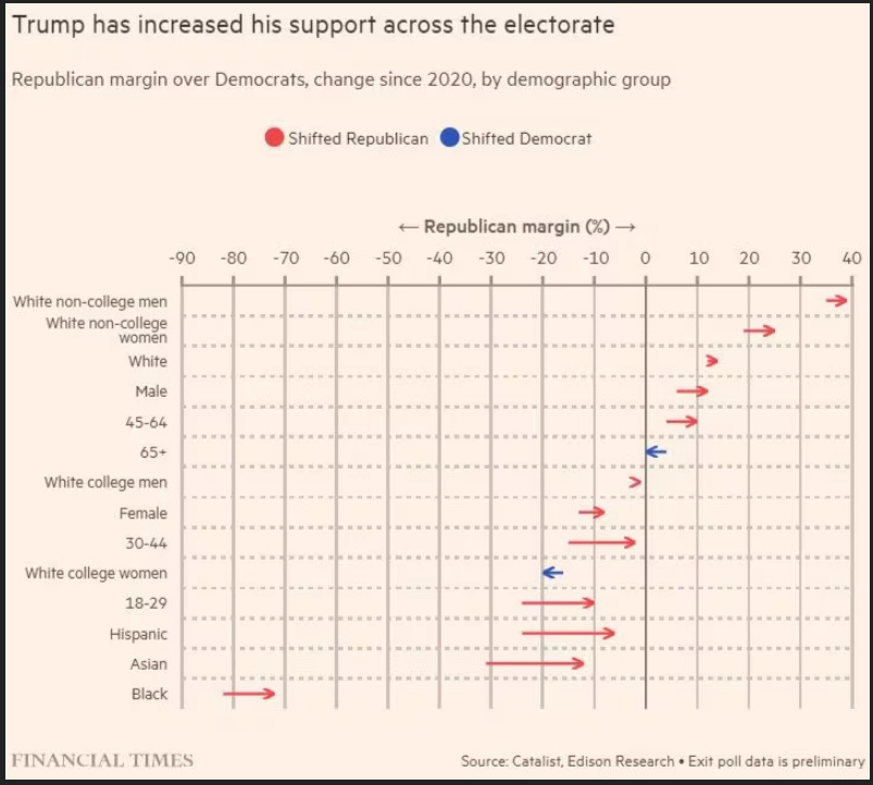 18세~29세 남성과 여성들의 트럼프 지지가 4년 전 보다 15%포인트, 7% 포인트 각각 높아져 공화당과 트럼피즘의 향후 가도(街道)에도 파란 불이 켜졌다. 올해 대선에서 남성들과 히스패닉 남성들의 2020년 대선 대비 트럼프 지지율 상승폭은 12%포인트, 9%포인트에 달했다. 트럼프 지지 증가는 65세 이상과 백인 대졸 여성을 제외한 대부분의 인종·연령 그룹과 모든 지역에서 공통됐다.