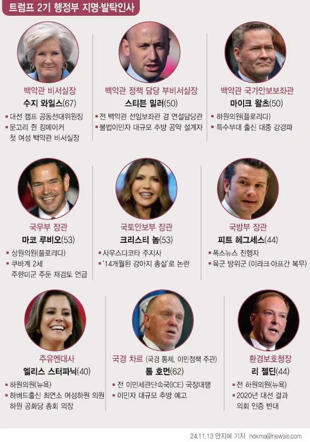 더욱이 트럼프 2기는 1기의 기조 위에서 더 세고, 더 강하고, 더 속도감있게 업그레이드된 ‘뉴 매가(New MAGA)’ 태풍을 전 세계에 발산할 것이다. 이를 위해 트럼프는 합리적 국제주의자들을 배제하고 ‘매가’ 이념을 추종하는 골수 충성파들을 장관과 백악관 고위직으로 속속 기용하고 있다.