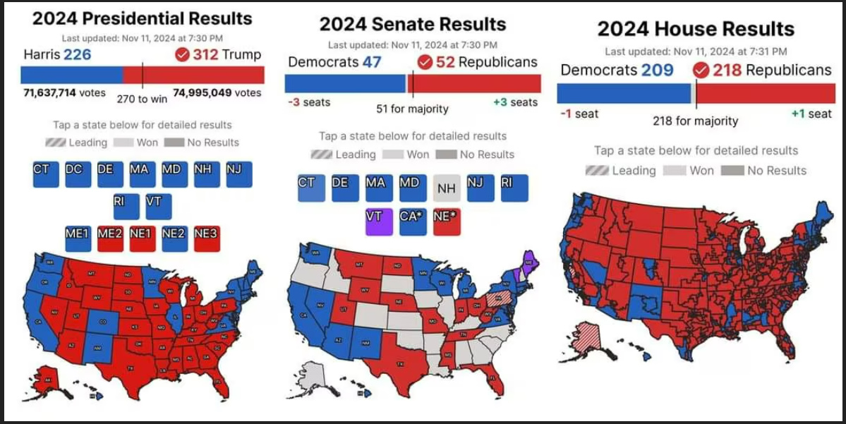 2024 대선의 가장 큰 특징은 미국 국민들이 트럼프에게 몰표를 주었다는 사실이다. 그는 7개 경합주와 전국 득표율, 연방 상원 및 하원의원 선거, 주(州) 지사, 주 의회 선거까지 싹쓸이했다. 공화당 후보의 전국 득표율 과반 획득은 2004년 이후 20년 만이다.