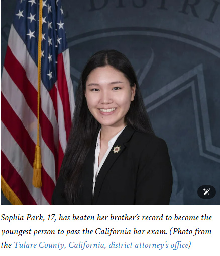 캘리포니아주 툴레어 카운티 지방검찰청은 지난 13일 "남매 라이벌! 툴레어 카운티 지검의 검사 시보가 오빠의 기록을 깨고 캘리포니아 변호사 시험 최연소 합격자가 되다"라는 제목으로 이 검찰청의 시보 소피아 박(17)의 성과를 소개했다.