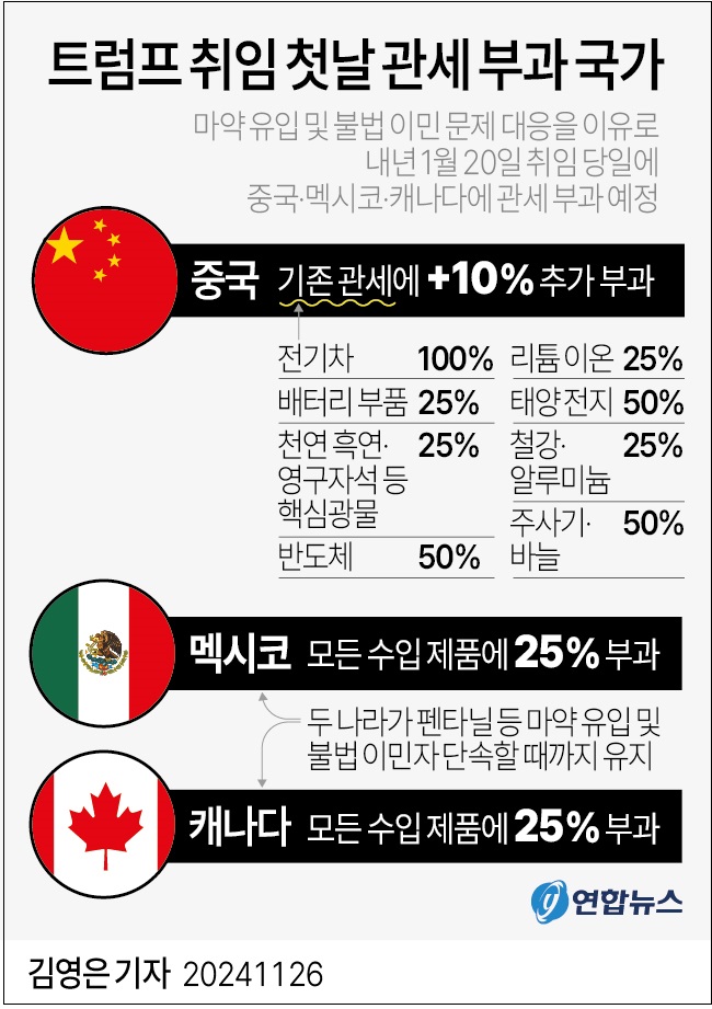 어쩌나! 트럼프 취임 후 첫 관세 부과 국가...중국, 멕시코, 캐나다 Trump says Mexico and Canada will get hit with 25% import tariffs on all goods once he takes office