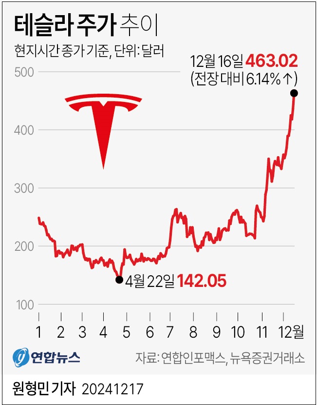 16일(현지시간) 뉴욕증시에서 테슬라는 전장보다 6.14% 오른 463.02달러에 마감했다.