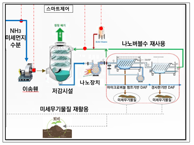 이에 건설연 환경연구본부 연구팀(팀장 정원식 박사)은 비료 제조시설에서 배출되는 암모니아 및 미세먼지를 효율적으로 저감할 수 있는 나노기술 기반 세정시스템을 개발하였다. 이 개발 기술은 기존 세정시스템에 나노에멀션장치와 부상분리(DAF; Dissolved Air Flotation)를 적용하여, 미세먼지 및 악취 포집 효율을 향상시키고, 세정폐수의 사용 기한도 연장하여 약품비 절감 등의 효과도 동시에 얻을 수 있다.