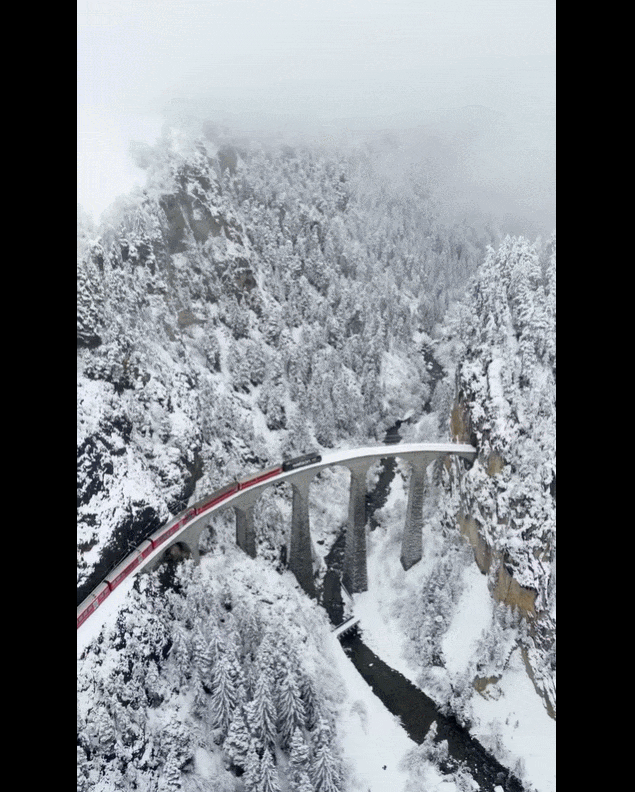 단단한 암벽을 뚫어 만든 길이 142m, 높이 65m의 압도적인 구름다리. 스위스의 자연 × 건축 × 기술이 완벽한 조화를 이룬 스위스 기차여행의 하이라이트✨베르니나 특급열차의 백미로 꼽히는 이곳은 전 세계 여행자들이 가장 많이 카메라에 담는 스위스 기차여행의 상징적인 순간이기도 합니다.