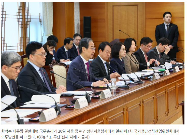 한덕수 대통령 권한대행 국무총리는 20일 ‘제7차 국가첨단전략산업위원회’를 주재하며 “글로벌 경쟁력 확보를 위한 국내산업의 체질 개선 노력과 함께 대외 불확실성을 기회로 삼기 위한 만반의 대비가 절실한 시점”이라고 밝혔다.