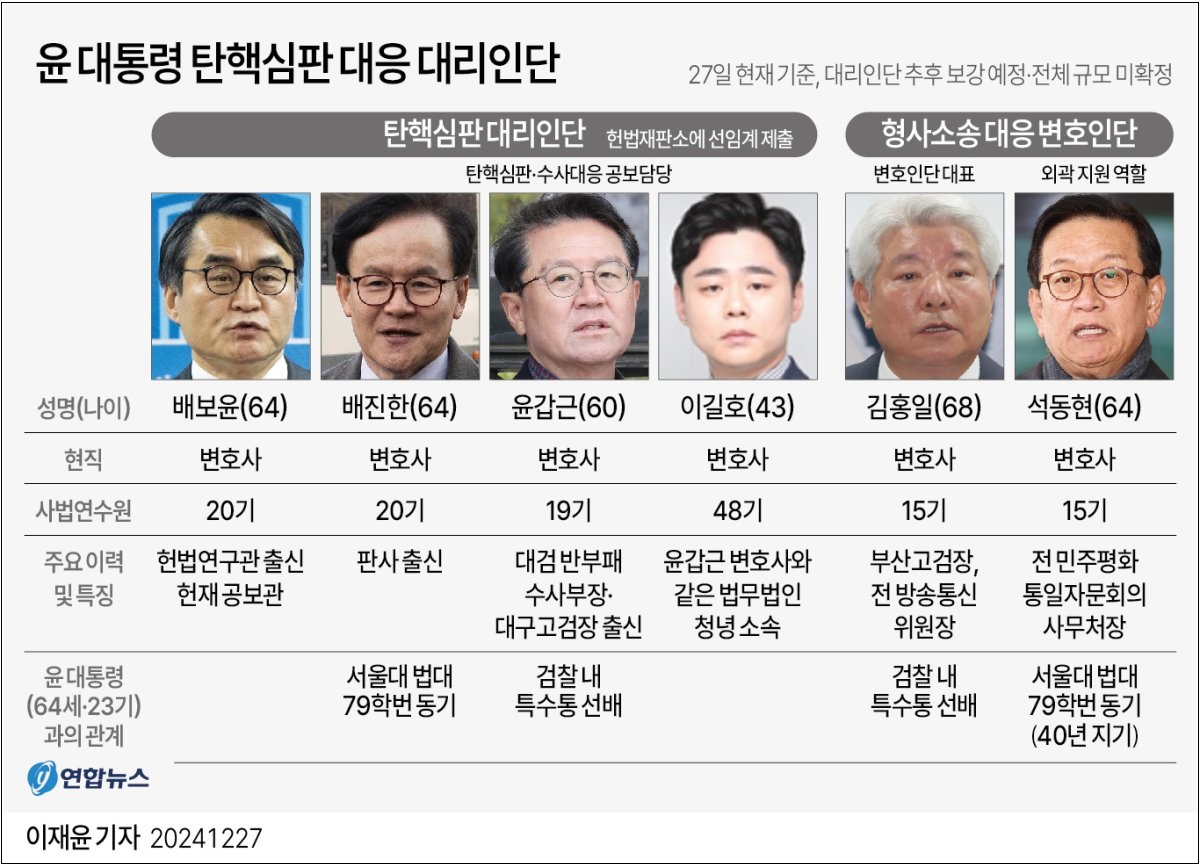 윤석열 대통령이 탄핵심판에서 대응할 대리인단을 선임하고 27일 변론준비기일 절차를 시작으로 변론 대응에 나섰다.