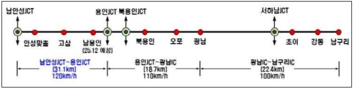 남안성 분기점에서 용인 분기점 구간(31.1km)은 국내 최초로 제한속도 120km/h를 도입하여 보다 빠르게 이동할 수 있도록 하였으며