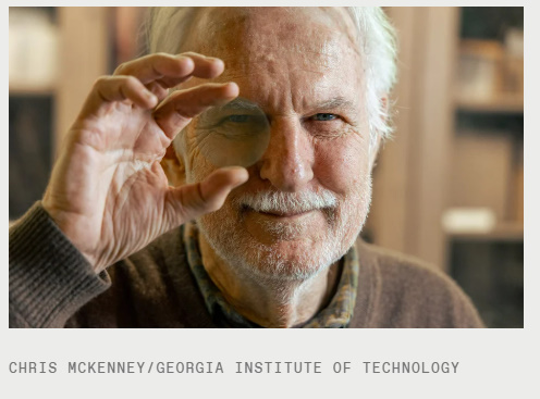 흰 머리카락과 수염, 콧수염을 기른 남자가 눈 앞에 둥근 모양의 재료를 들고 있다. 크리스 맥케니/조지아 공과대학