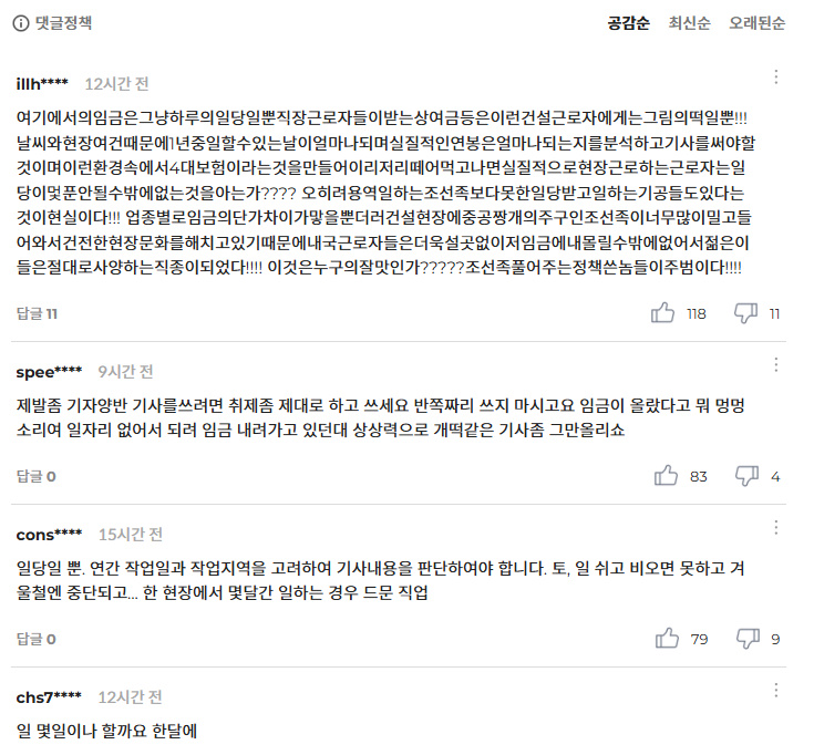 조사 결과 올 상반기 하루 평균 건설 임금은 27만6011원으로 지난해 상반기 27만789원보다 1.93% 상승했다. 작년 하반기 27만4286원보다도 0.63% 더 올랐다. 분야별로 세부 직종 수가 가장 많은 일반 공사 직종의 하루 평균 임금이 26만4277원으로 작년 상반기보다 2.29%, 작년 하반기보다 0.84% 늘었다. 일반 공사 직종에는 철근, 용접, 콘크리트, 창호, 도배, 배관 등 91개 직종이 포함된다.