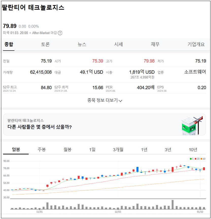 5일 예탁결제원에 따르면 지난해 12월 3일부터 올해 1월 3일까지 한달간 서학개미들이 가장 많이 사들인(순매수) 종목 2, 3위에 팰런티어 테크놀로지스(이하 팰런티어, 4억 6582만 달러)와 브로드컴(3억 6595만 달러)이 올랐다. 한화로 두 종목 합산 순매수액은 1조 2244억 원으로 같은 기간 순매수 1위를 기록한 테슬라(6억 7693만 달러, 9964억 원)를 훌쩍 넘어섰다. AI 대장주 엔비디아는 이 기간 중 순매수 상위 50위권에도 포함되지 못했다.