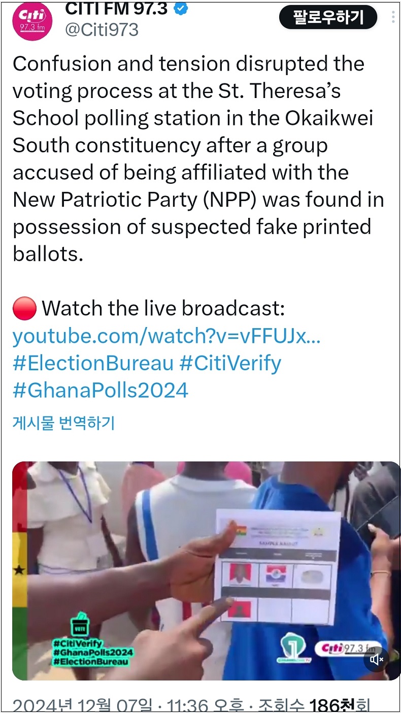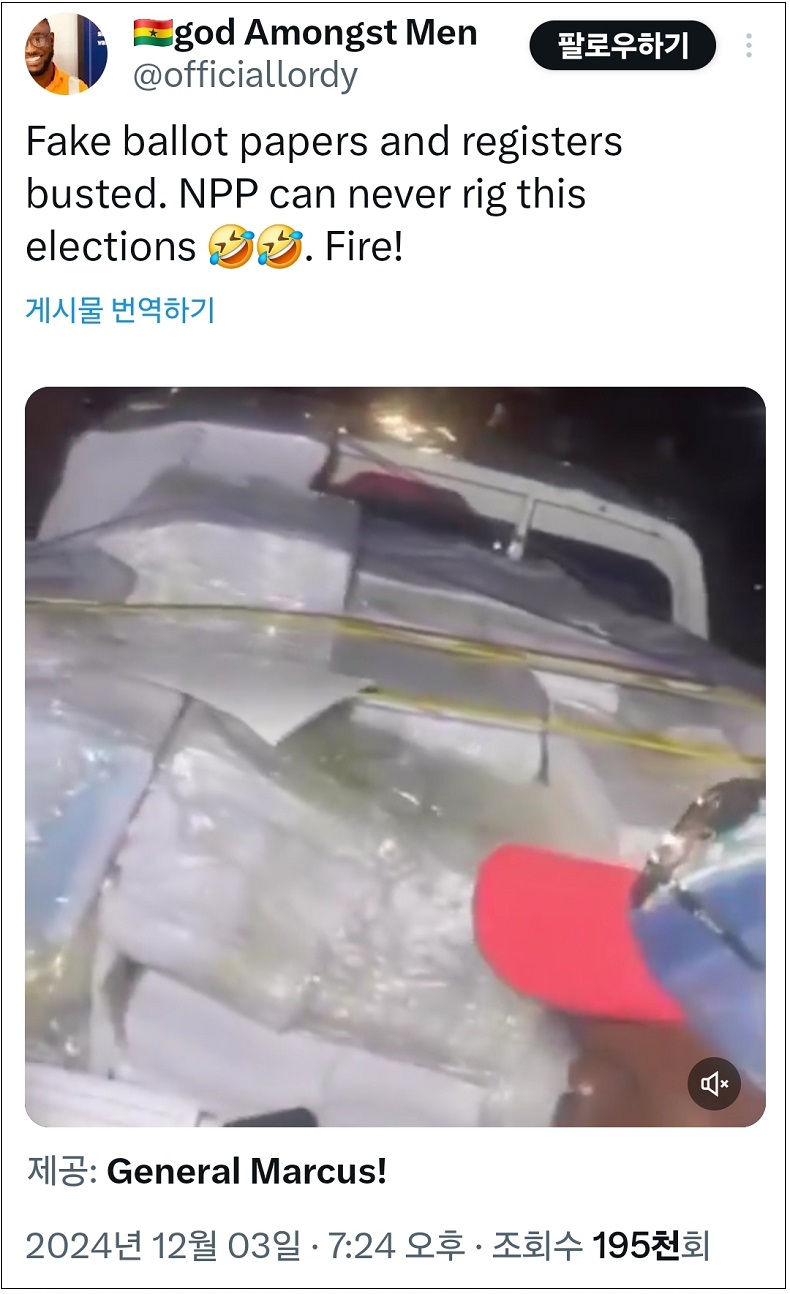 한편, 16일자 스카이데일리는 지난 12.3 비상계엄 당시 99명의 중국인이 선거연수원에서 체포되어 일본의 오키나와 미군기지로 압송돼 조사 받았다고 단독 보도했다. 공교롭게도 우리나라 비상 계엄 당시 가나는 오후 2시 경으로 사전투표가 진행됐다. 이날 가나 현지에서는 사전 투표 후 한 픽업트럭에서 다량의 투표지와 등록부가 발견되어 부정선거 논란이 크게 일었다.