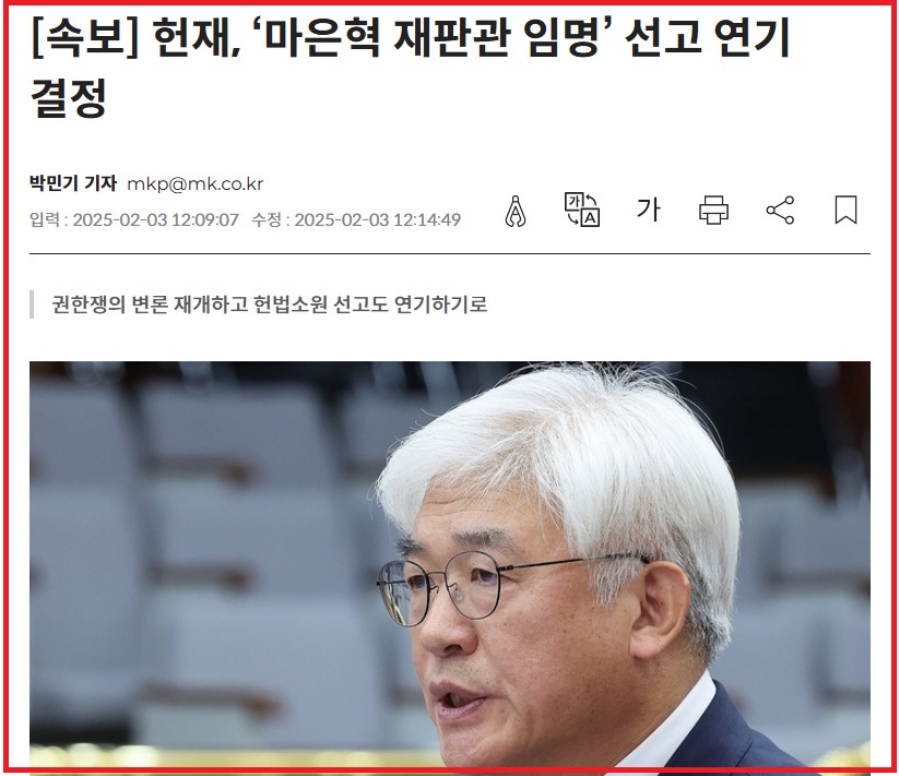 헌재, 마은혁 재판관 임명 선고일 연기 결정...왜