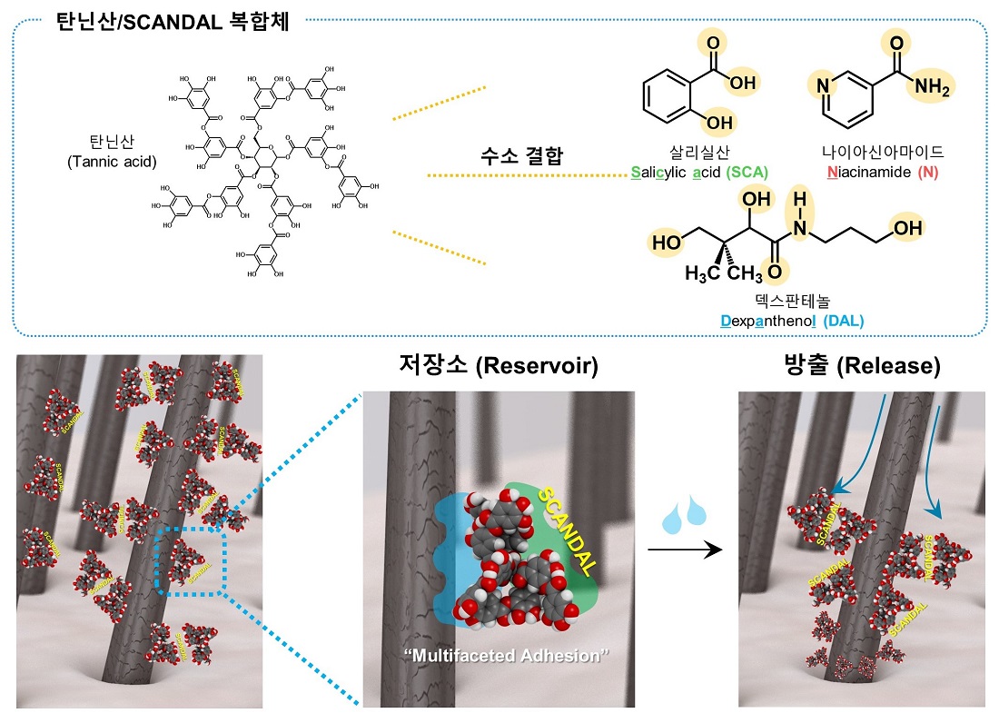특히 연구팀은 살리실산(salicylic acid, SCA), 니아신아마이드(niacinamide, N), 덱스판테놀(dexpanthenol, DAL) 등 탈모 완화 기능성 성분을 포함한 조합을 개발하고, 이를 ‘스캔달(SCANDAL)’이라 명명했다. 연구 결과, 탄닌산과 결합된 스캔달 복합체는 수분과 접촉하면 점진적으로 방출되며, 모발 표면을 따라 모낭으로 전달되는 것으로 나타났다.