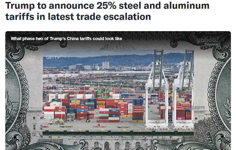 트럼프, 모든 철강 알루미늄에 관세 25% 부과키로 Trump to announce 25% steel and aluminum tariffs in latest trade escalation