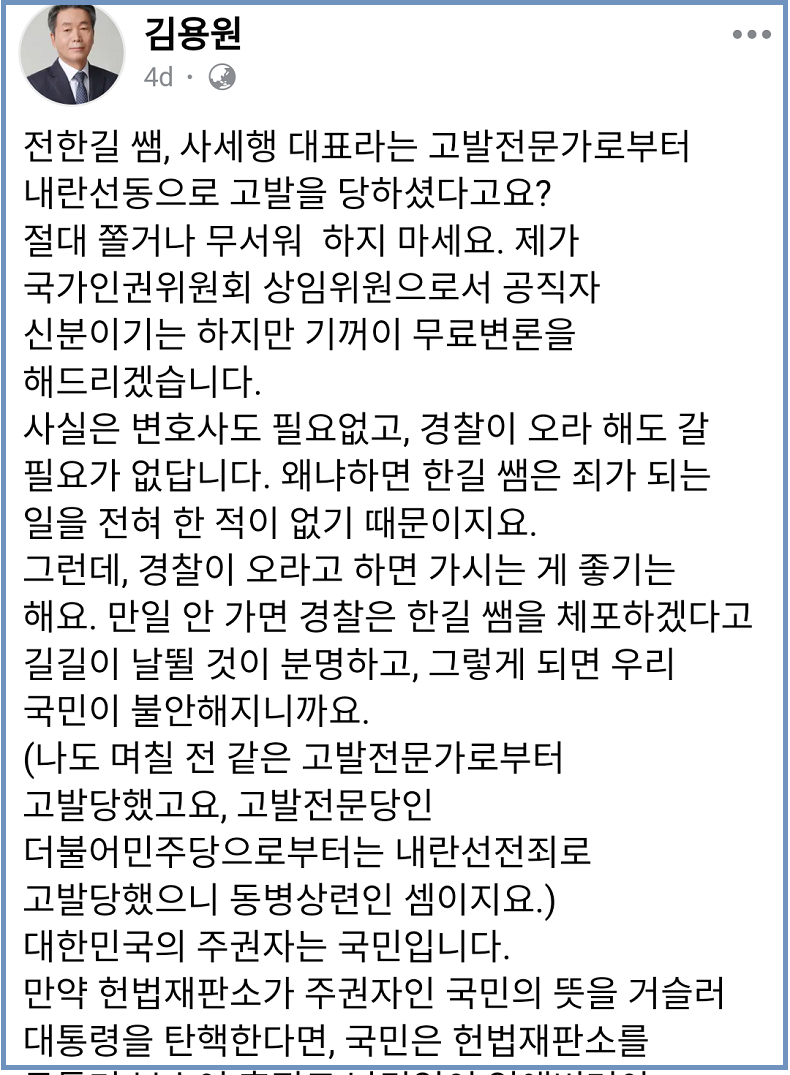 국가권익위 상임위원, 전한길 선생 자유수호 투쟁에 감사