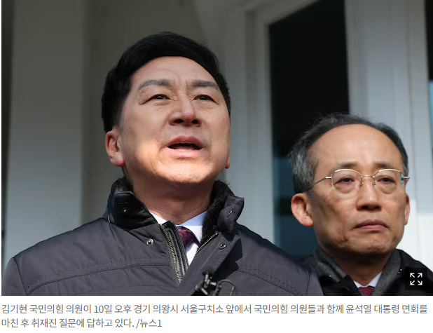 김기현 국민의힘 의원이 10일 오후 경기 의왕시 서울구치소 앞에서 국민의힘 의원들과 함께 윤석열 대통령 면회를 마친 후 취재진 질문에 답하고 있다. /뉴스1
