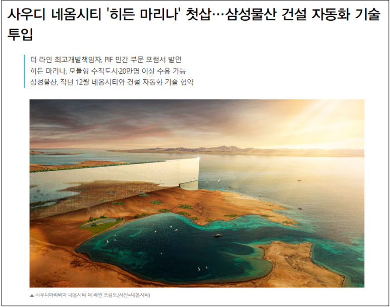 사우디아라비아 네옴시티의 핵심 도시 중 하나인 '히든 마리나(Hidden Marina)'가 착공에 들어갔다. 히든 마리나는 네옴시티 더 라인(THE LINE)의 첫 번째 단계로, 여기에는 삼성물산의 건설 자동화 기술이 투입된다.