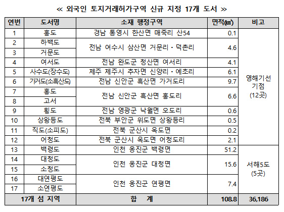 국경 도서 17곳, 외국인 토지거래허가구역 지정