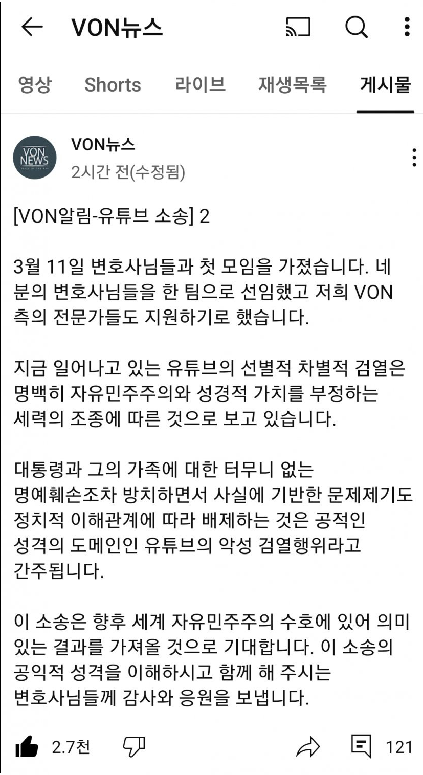 VON, 편파 '유튜브 검열' 구글코리아 고발