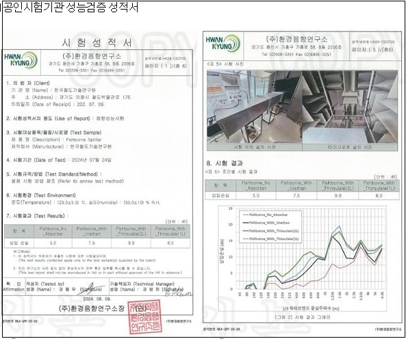 공인시험기관에서 진행한 성능 시험 결과, 피시본 소음기는 500~5000Hz 주파수 대역에서 기존 방식 대비 평균 10dB 이상의 소음 저감 효과를 보였다.