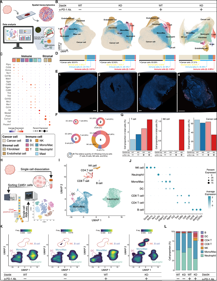 아울러 세포 수준에서 유전자 발현을 분석하는 기술인 단일세포 전사체 분석 및 공간전사체 분석 결과, 발굴된 핵심인자를 제어하는 동반치료가 면역항암치료를 통해 암을 억제하는 효과를 가지는 T 세포와 기억 T 세포의 분화를 촉진하였다. 동시에, 암세포 성장을 돕는 조절 T 세포와 탈진된 T 세포의 침윤을 억제하는 효과가 있음이 확인되었다.