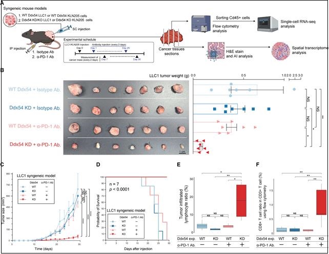 그리고 이 핵심인자를 동종(Syngeneic) 폐암 마우스 모델에서 억제한 뒤 면역항암치료 반응성을 조사한 결과, T 세포, NK세포 등 항암 면역세포의 조직 내 침윤이 크게 증가함과 동시에 면역항암치료 반응성도 현저히 높아진다는 것을 확인하였다.