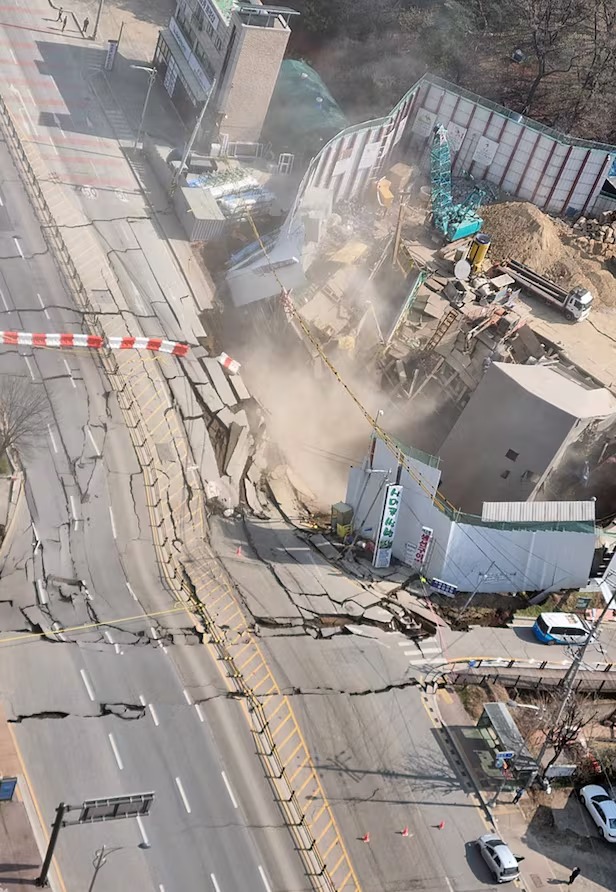 사고 현장 지상의 공사 시설물들과 도로는 현재 금이 간 상태로 주저 앉아있다.