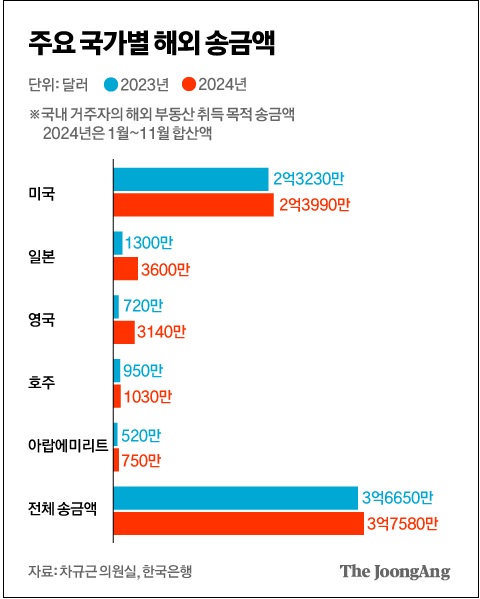 이들은 지난해 해외에서 5000억원 넘게 부동산 쇼핑도 했다. 차규근 의원실(조국혁신당)이 한국은행에서 받은 자료에 따르면 지난해 1월부터 11월까지 국내 거주자(개인+법인)가 해외 부동산 취득을 위해 해외로 송금한 금액은 3억7580만 달러(약 5354억원)로 집계됐다. 2023년 전체 송금액(3억6650만 달러)을 넘어섰다. 미국 투자이민의 최소 투자금이 2022년 80만 달러(약 11억원)로 뛰면서 미국행 수요가 준 상황에서 해외 부동산 쇼핑(취득)은 꾸준히 늘고 있다. 미국행 허들이 높아지자 일본·영국·호주·아랍에미리트 등지로 눈을 돌린 영향이다