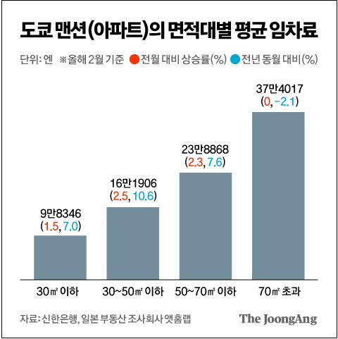 투자 유목민은 올해 엔화가치가 뛰는데도 일본 부동산에 관심이 많다. 도쿄 등 대도시 중심으로 임대 수익률과 집값이 동시에 들썩이고 있어서다. 양종욱 신한은행 부동산투자자문센터 팀장은 “국내 투자자가 일본에 법인을 설립하면, 2% 초·중반 금리로 빚을 낼 수 있는 데다 임대수익률은 한국보다 높다”며 “요즘도 도쿄, 오사카, 교토 등 대도시 중심으로 투자 수요가 많다”고 말했다. 신한은행에 따르면 올해 2월 소규모 도쿄 맨션(면적은 30㎡ 이하)의 평균 임차료는 9만8346엔으로 1년 전보다 7% 뛰었다.
