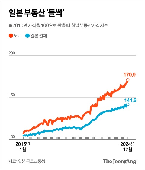 일본 국토교토성에 따르면 도쿄 부동산가격지수(2010년=100)는 지난해 12월 170.9로 5년 만에 33.8% 급등했다. 일본 전체로 넓혀보면 같은 기간 평균 25% 뛰었다.