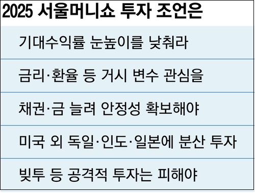 재테크 고수들이 제시한 5대 투자 조언·원칙으로 △수익률 눈높이를 낮추고 △금리와 환율 등 거시경제 분석 후 투자 △마음 편한 포트폴리오를 위한 안전자산 비중 확대 △위험자산 내 미국 주식 등 달러 자산 비중 축소 △레버리지(대출)를 통한 고수익 추구 금물 등이다.