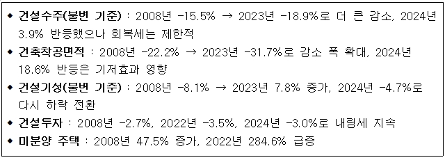 경제 저성장, 신속한 금리인하가 어려운 금융 여건, 높은 공사비, 주택 수요 위축, 제한적인 정부 대응 여력 등으로 인해 회복 동력 또한 과거보다 제약적인 구조에 놓여 있다는 점에서, 단기 부양책과 더불어 산업 구조 개선과 미래 대응 전략 수립이 함께 추진되어야 할 시점임을 시사한다.