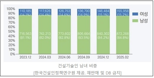 여성 건설기술인 비중은 2023년 12월 14.1%, 작년 6월 14.6% 등으로 꾸준히 늘고 있다.