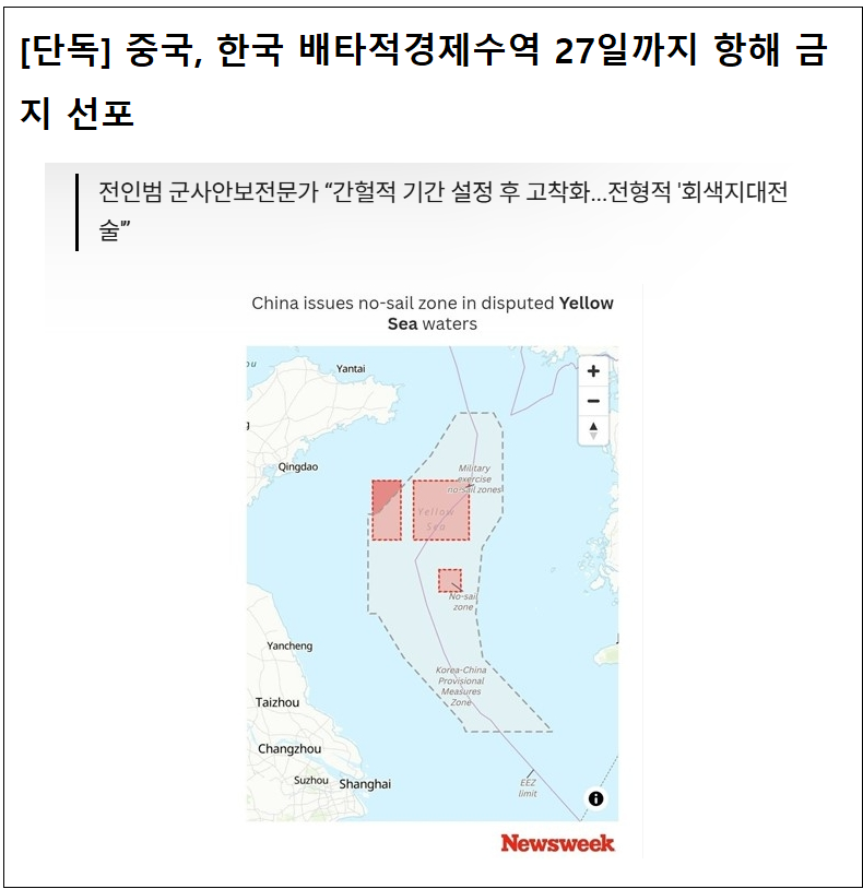 중국, 한국 배타적경제수역(EEZ) 내 항해금지 선포 China Issues No-Go Zone in Disputed Waters Claimed by US Ally