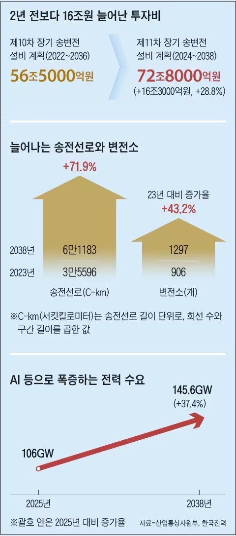한국전력이 2038년까지 전력망 확충에 72조8000억원을 투자하기로 했다. AI(인공지능) 확산으로 전력 수요가 폭증하고, 재생에너지 발전량이 늘면서 2년 전 발표한 계획보다 투자비가 16조3000억원(28.8%) 늘어난 것이다. 송전선로도 2023년보다 70% 이상 늘어나고, 변전소도 같은 기간 400곳 가까이 더 짓기로 했다. 전력 당국에 따르면 올해 106GW(기가와트)로 추정되는 전력 수요는 데이터센터와 반도체 클러스터 건설, 전기차 보급 등에 따라 2038년에는 37.4% 급증한 145.6GW에 이를 것으로 추산된다. 또 날씨나 시간에 따라 발전량 변화가 많은 재생에너지도 같은 설비 용량의 화력발전소나 원전과 비교해 송전선로가 2~3배 필요하다 보니 투자액이 급증하는 것이다.