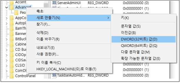 컴퓨터\HKEY_CURRENT_USER\SOFTWARE\Microsoft\Windows\CurrentVersion\Explorer\Advanced