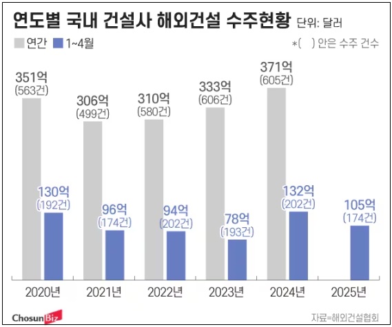 3일 해외건설협회에 따르면 올해 4월 30일 기준 국내 건설사의 해외 건설 누적 수주 금액은 105억달러를 기록했다. 이는 지난해 같은 기간 132억달러에 비하면 20% 감소한 금액이다. 올해 4월 말 누적 수주 건수도 174건으로, 지난해(202건)보다 14% 줄었다.