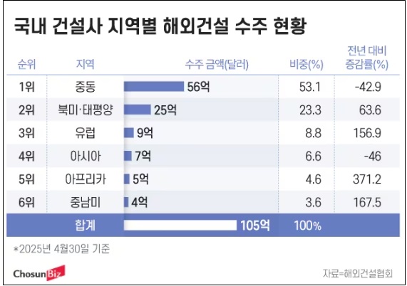 1~4월 105억 달러 수주…중동·아시아 40%↓