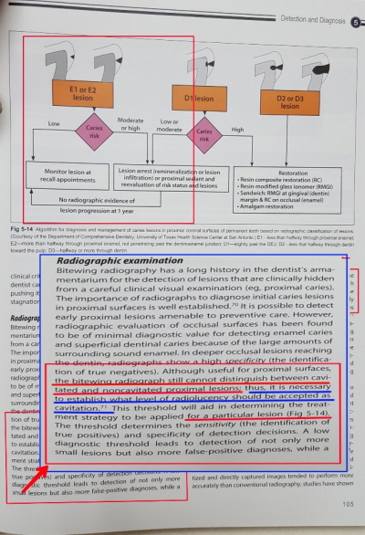 우리나라는 작은 것도 빨리 치료해야 돈도 적게 들고, 안 아프다고 얘기를 하죠. 그런데 보세요. 미국 치과 교과서를 보면 초기 충치는 환자가 관리를 잘한다면 지켜보고, 관리를 잘 못하면 불소도포 하는 식이에요. 심지어 조금 진행된 충치더라도 환자가 양치를 잘하면 지켜보고, 아니면 치료하라고 되어 있어요. 반면 우리나라 치과 교과서는 치료를 권장하는 내용이 있는 건 아니지만, 하지 말라는 내용도 없거든요. 더 의사의 자율에 맡기니까 초기에도 치료를 하는 의사가 있는 거예요.
