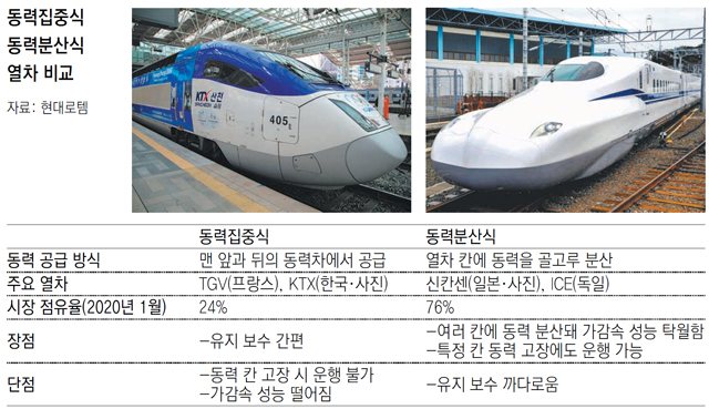 현대로템 역시 2010년대 초반 EMU 고속열차 기술을 확보했지만 해외 고속열차 수출 실적이 1건도 없다. 해외 시장에서는 EMU 수요가 높지만, 정작 수출을 위해 필요한 국내 상업운행 실적이 ‘0’이었기 때문이다. 2010년대 SRT, 강릉선 등 새 고속열차 발주 기회가 있었지만 정부는 모두 동력집중식을 선택했다. 철도업계 관계자는 “한국에서도 EMU 방식이 가능했지만 기존에 경험이 있어 빨리 제작할 수 있는 집중식 방식의 열차를 정부가 우선 투입해 왔다”고 말했다.