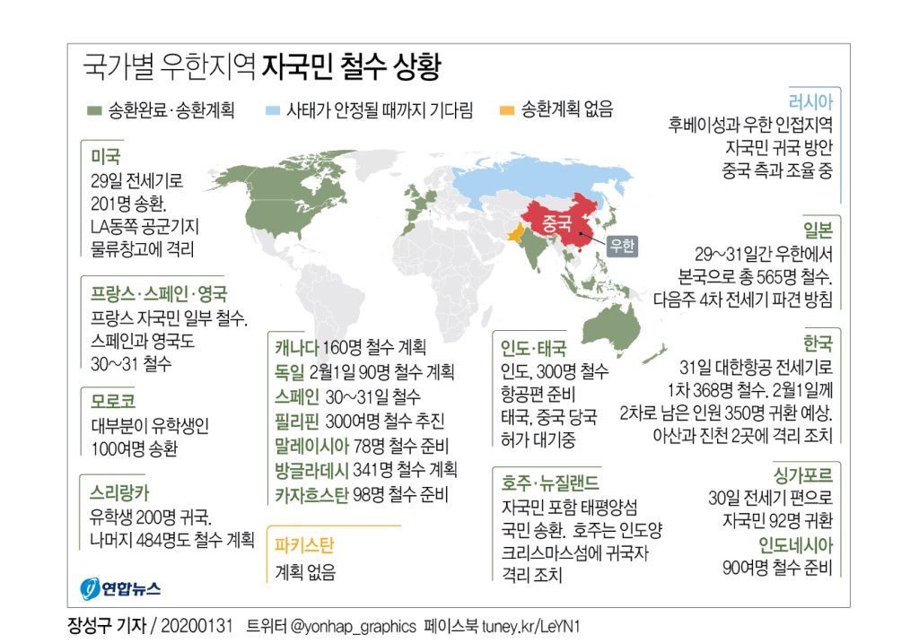 신종 코로나바이러스 감염증(신종코로나)이 급속히 확산하는 가운데 세계 각국이 전세기를 동원해 발병 근원지인 중국 후베이(湖北)성 우한(武漢)시에서 자국민의 탈출을 서두르고 있다.