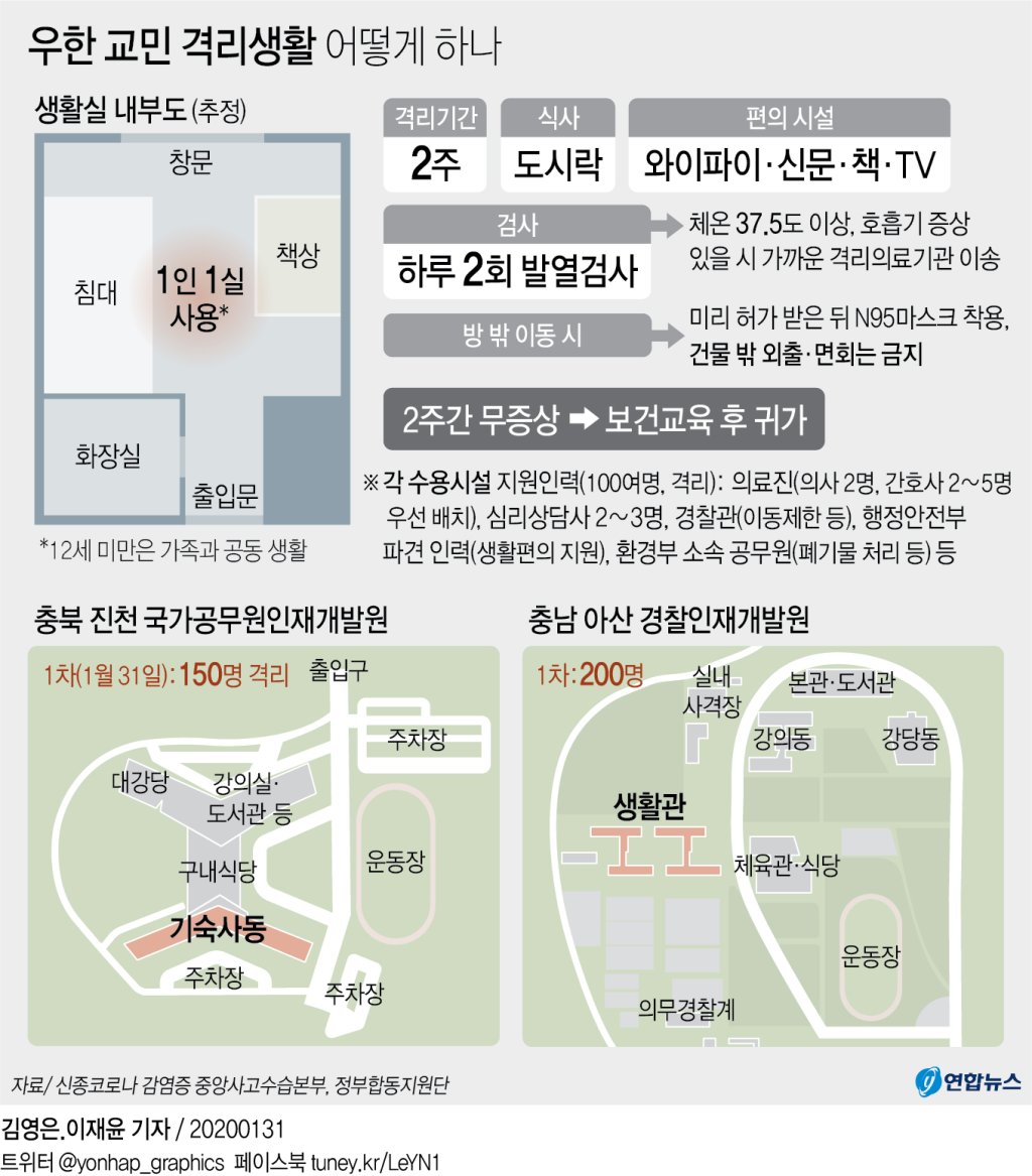 교민들은 임시 생활시설에 약 2주간 격리수용된 뒤 특별한 증상이 없으면 보건교육을 받은 후 귀가할 예정이다.