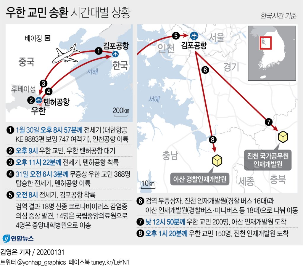 귀국한 교민 368명 가운데 발열 증세를 보인 18명은 의료기관으로 이송됐고, 나머지 200명은 이날 낮 12시 50분께 충남 아산 경찰인재개발원에 도착했다.