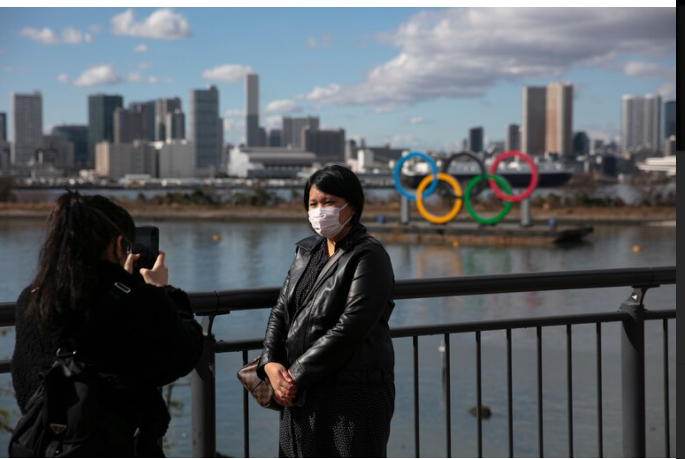A tourist wearing a mask pauses for photos with the Olympic rings in the background Wednesday. (Jae C. Hong)/Washingtonpost