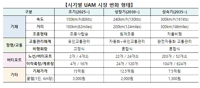 ‘35년 성숙기가 되면 배터리 용량 증대 및 기체 경량화에 힘입어 비행가능 거리도 300Km(서울~대구 정도)로 증가하게 되고, 속도도 ’25년 150km/h에서 300km/h로 빨라진다.